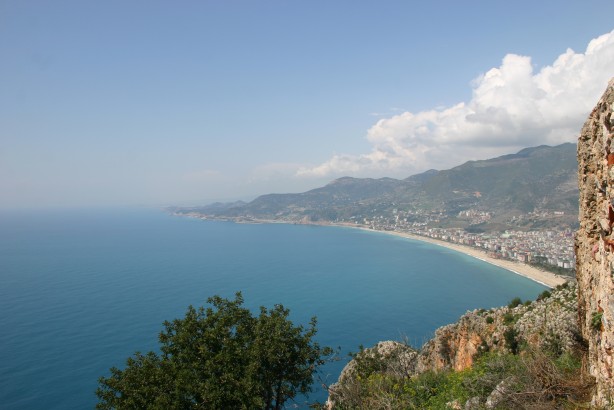 Blick vom Kastell über Alanya auf die Küste Richtung Side/Antalya (links) sowie die Stadt Alanya (rechts).